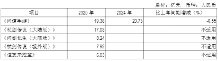 海外业务的增长同样是由于新产品带动。财报披露,2025年上线的《杖剑传说(境外版)》《问剑长生(境外版)》等游戏贡献增量营业收入,而《飞吧龙骑士(境外版)》营业收入则同比大幅减少。